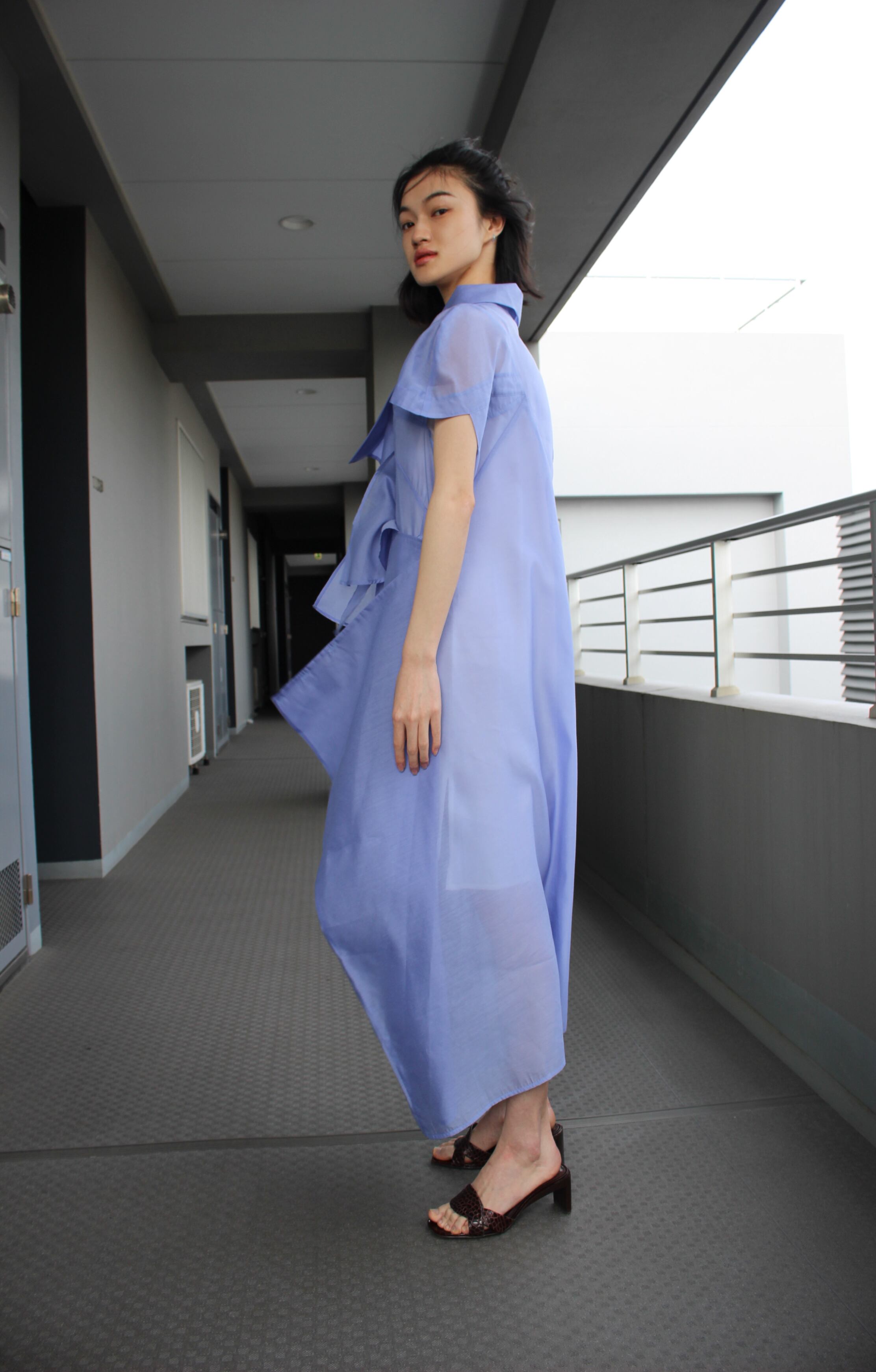 夏らしい透け感のある素材で仕上げたワンピース。きれいなブルーなのでお肌がとてもきれいに映るんです。ボリューム感たっぷりの襟はすっきりと