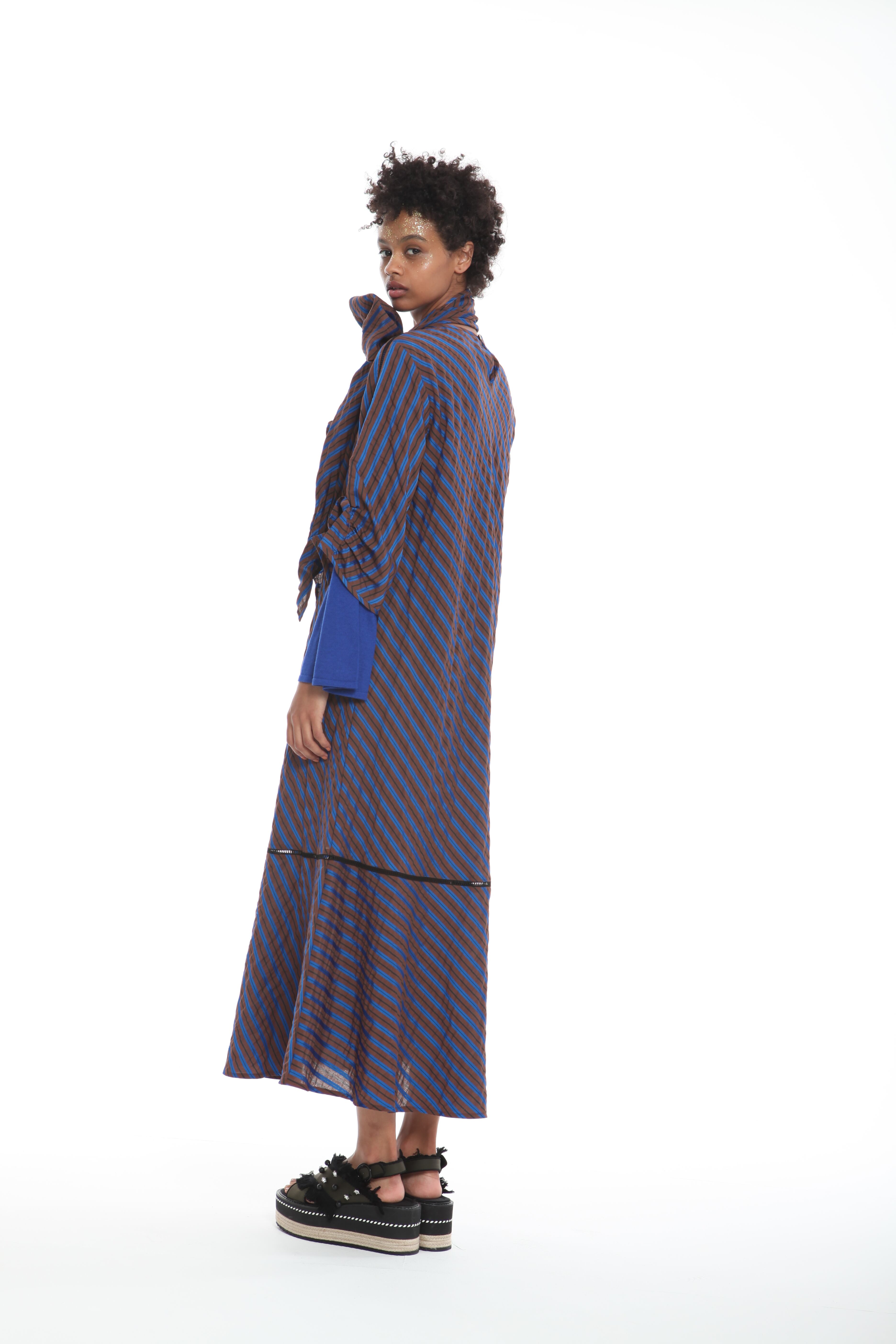 イタリア製先染めストライプのシルク混素材を使用し、独特なカラー使いが特徴です。すっきりとしたAラインシルエット、7~8分袖になります。