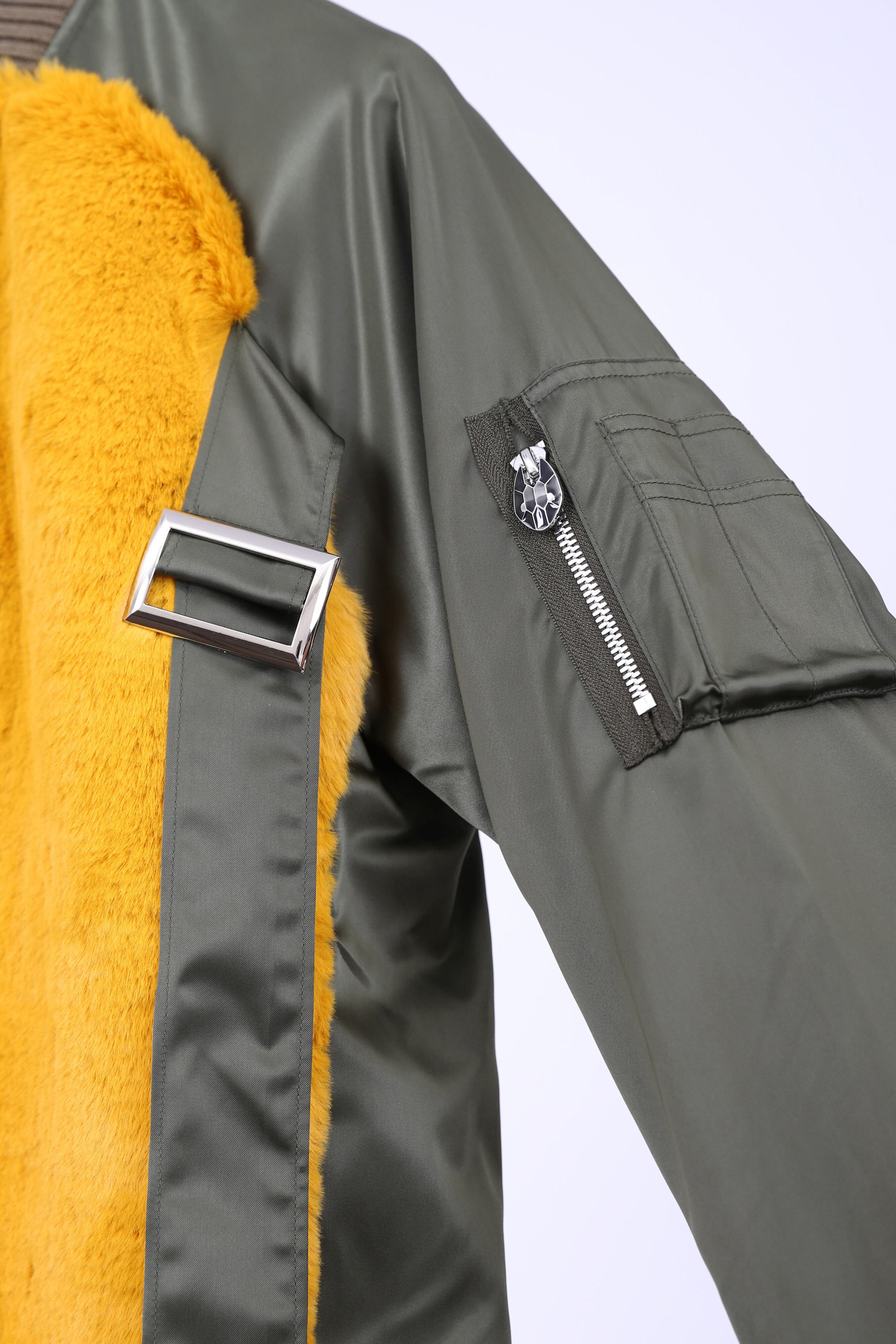 前後の身頃を発色の良いエコファーで切り替えたボンバージャケット。
